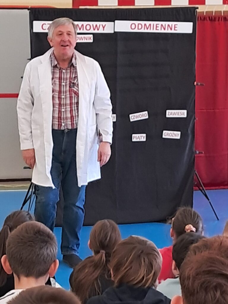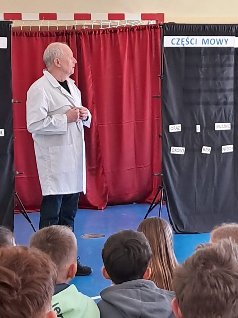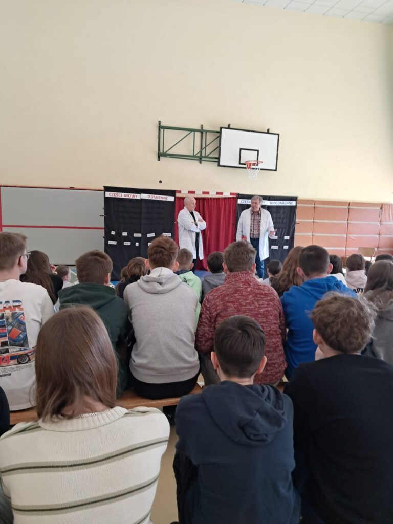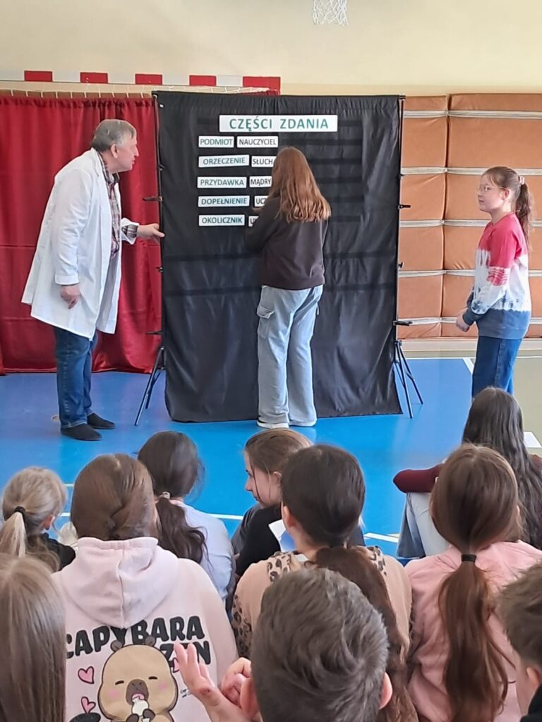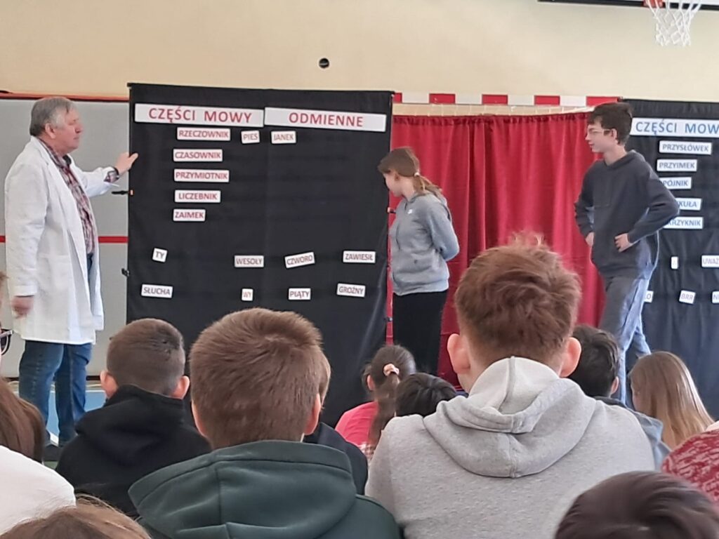 Tradycyjnie, jak co roku, gościliśmy aktorów krakowskich: Pana Wojciecha Habelę i Pana Jacka Leczmara, którzy w sposób atrakcyjny i angażujący przedstawili uczniom klas IV-VIII części zdania i mowy. Dzięki humorowi, scenkom teatralnym oraz aktywnemu udziałowi uczniów zagadnienia z zakresu języka polskiego stały się łatwiejsze do zrozumienia i zapamiętania. Spotkanie było nie tylko ciekawą lekcją, ale również świetną okazją do nauki poprzez zabawę.