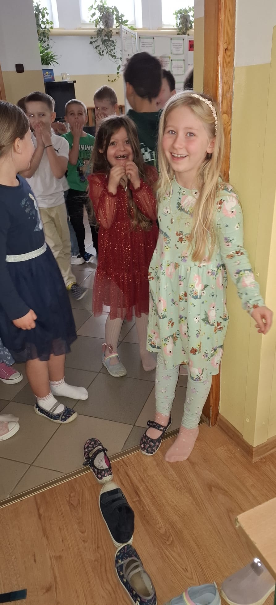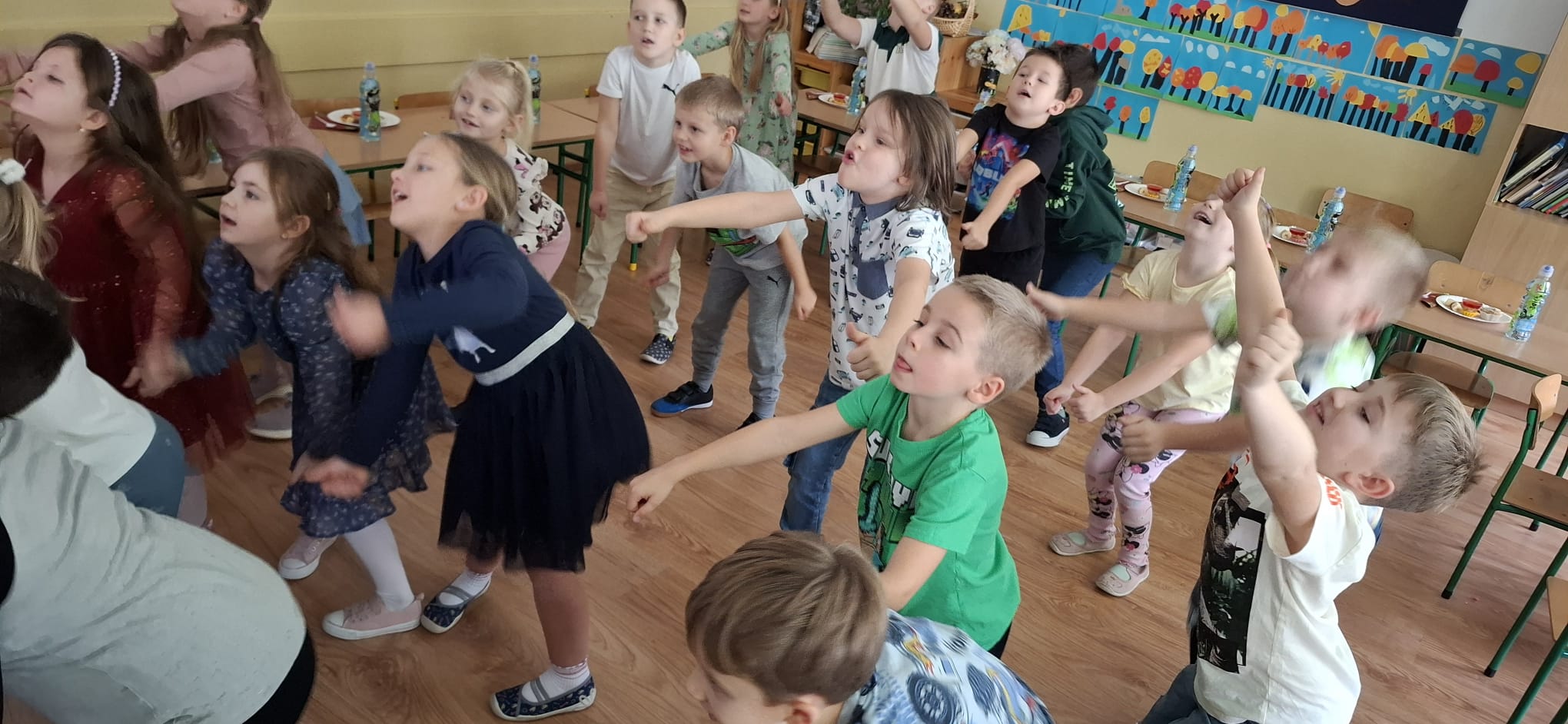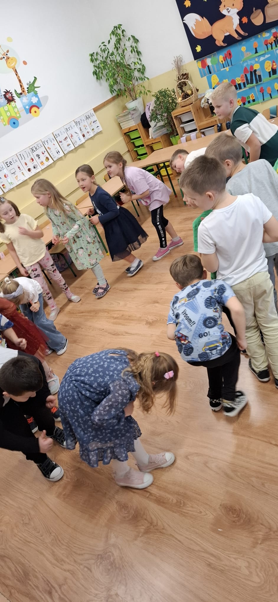 Następnie pierwszoklasiści wzięli udział w tańcach przy wesołych, dziecięcych melodiach, które były przeplatane różnorodnymi wróżbami andrzejkowymi. Radosna atmosfera udzielała się wszystkim, a uśmiechy nie schodziły dzieciom z twarzy.