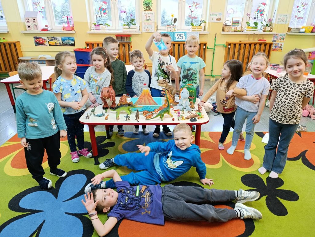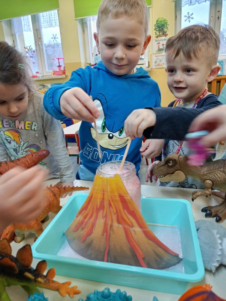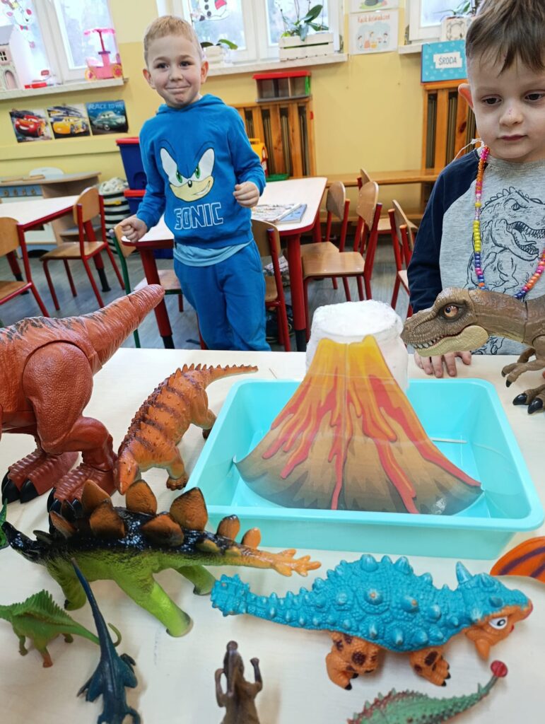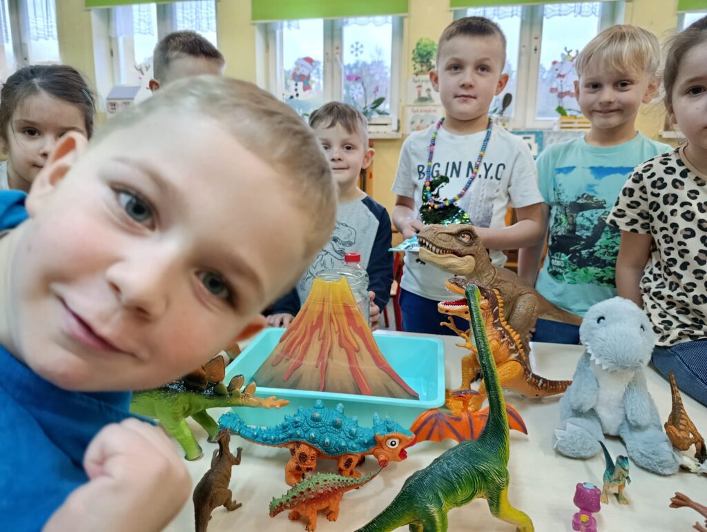 Realizując temat poświęcony prehistorii, przedszkolaki zgłębiły wiedzę na temat życia dinozaurów, poprzez obejrzenie ciekawych filmów edukacyjnych. Przedszkolaki przeprowadziły eksperyment z wulkanem, co sprawiło im niesamowitą radość.