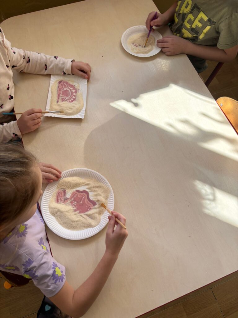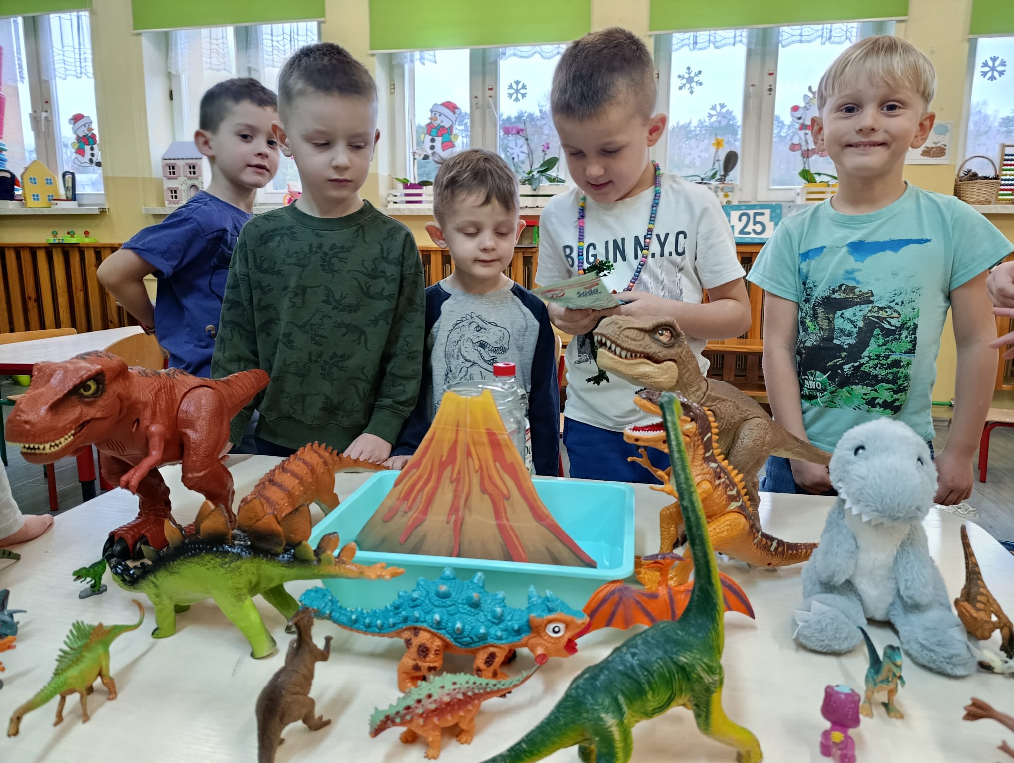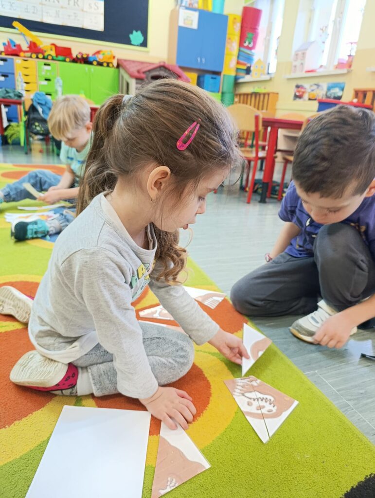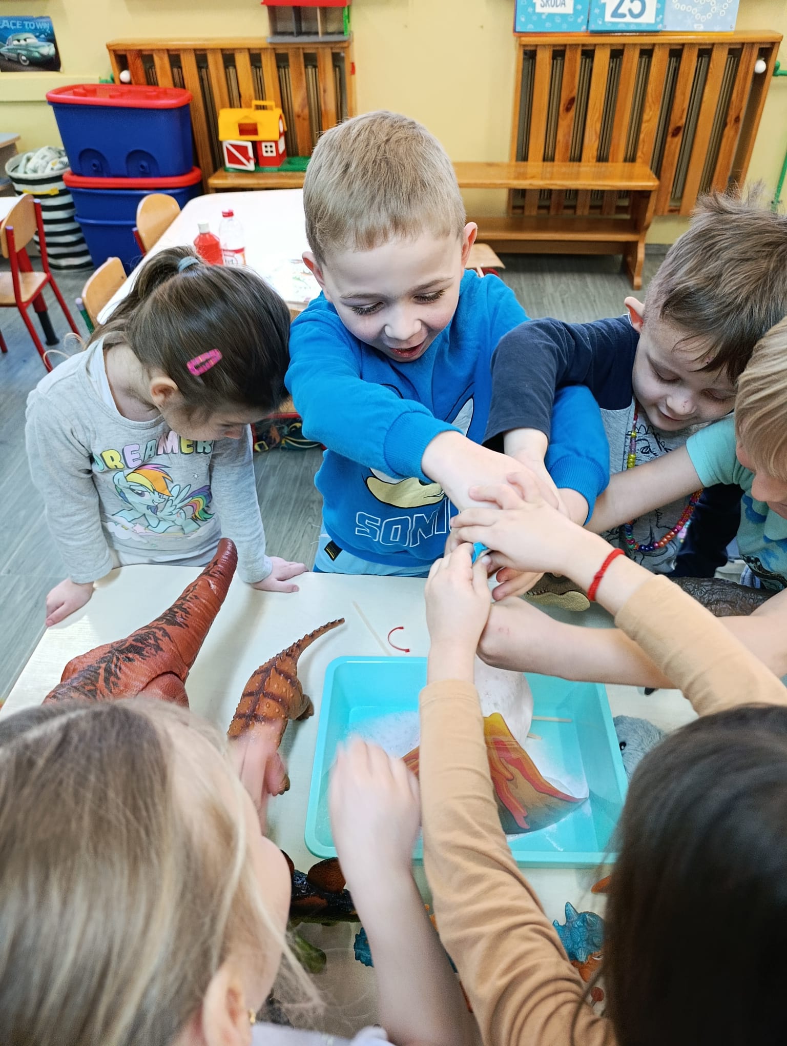 Realizując temat poświęcony prehistorii, przedszkolaki zgłębiły wiedzę na temat życia dinozaurów, poprzez obejrzenie ciekawych filmów edukacyjnych. Przedszkolaki przeprowadziły eksperyment z wulkanem, co sprawiło im niesamowitą radość.