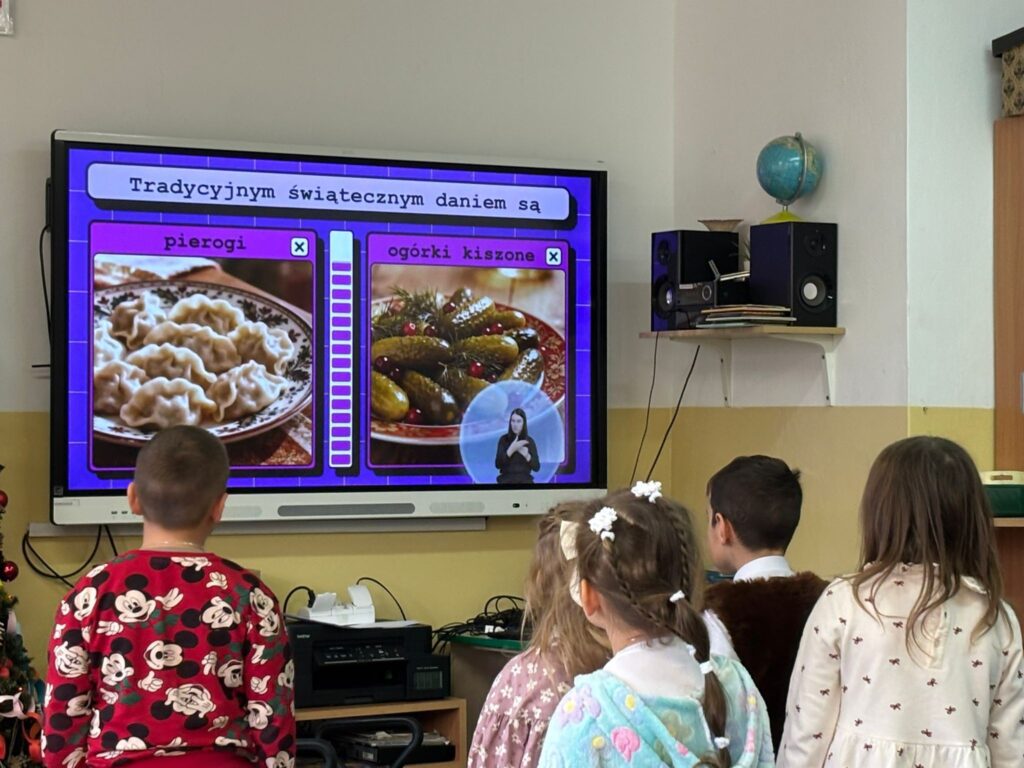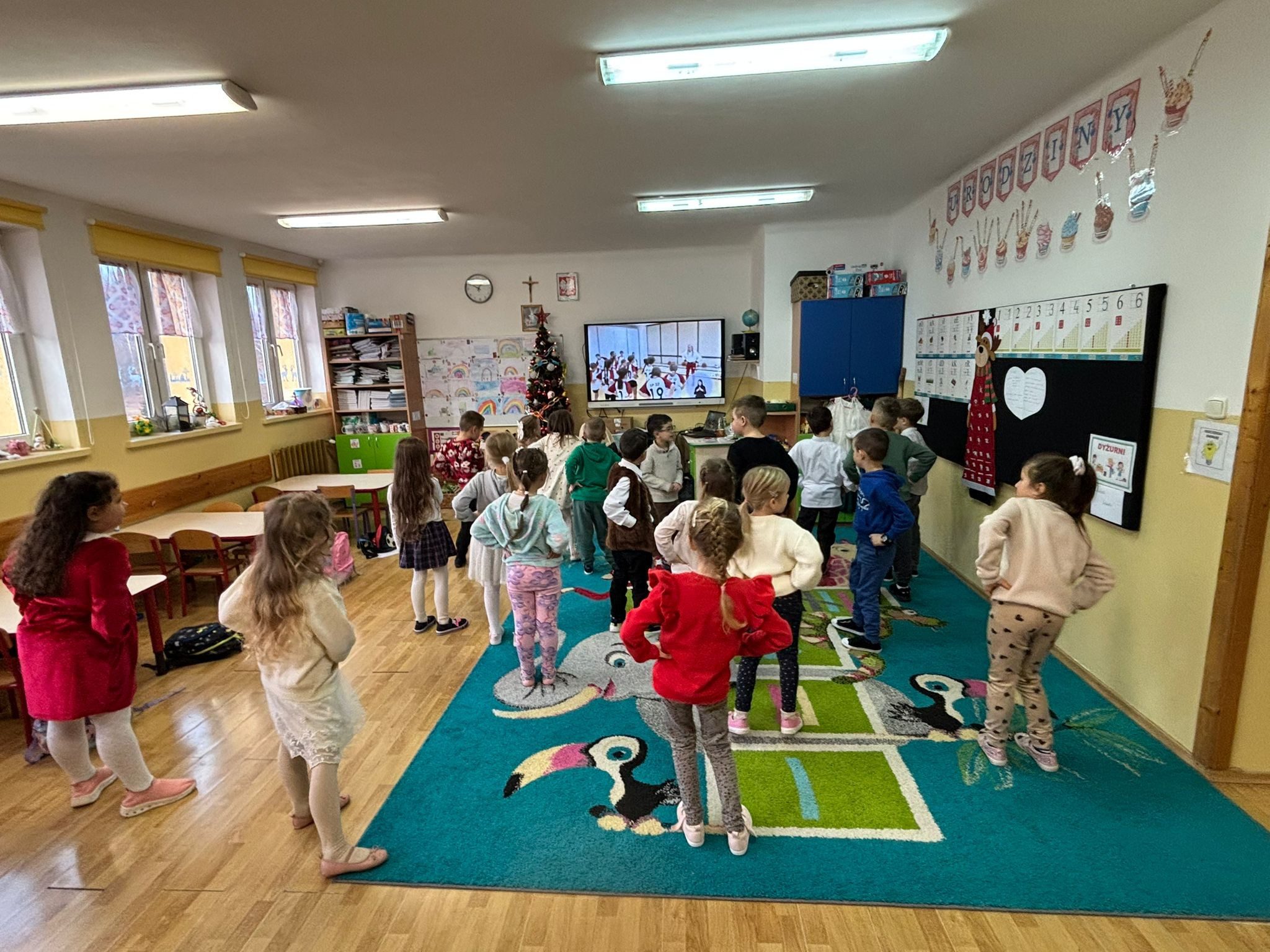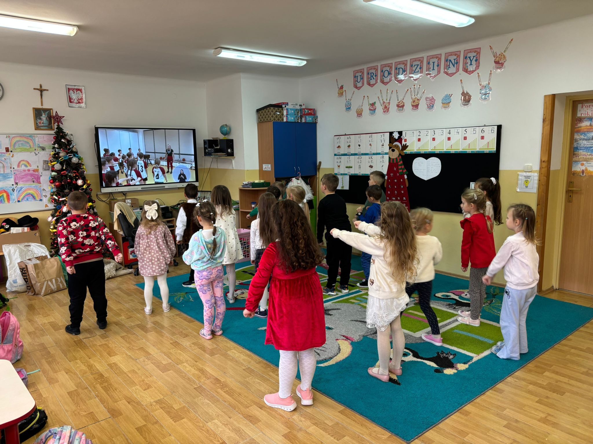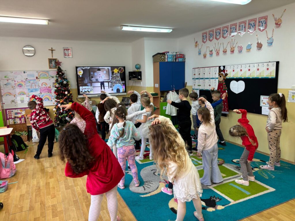 W zajęciach uczestniczyły dwa oddziały przedszkolne, czyli 38 uczniów, pod opieką 3 nauczycieli. Przez około 30 minut dzieci wspólnie ćwiczyły, bawiły się i odkrywały świąteczną tajemnicę w rytmie muzyki i z mnóstwem uśmiechu 😊💪.Zajęcia odbywały się przy użyciu monitorów wielofunkcyjnych dostępnych w salach, co zapewniło dobrą widoczność obrazu i dźwięku 💻🔊.