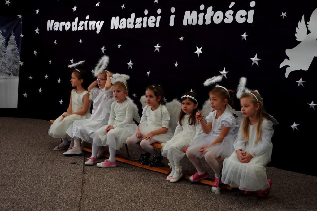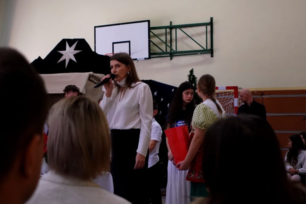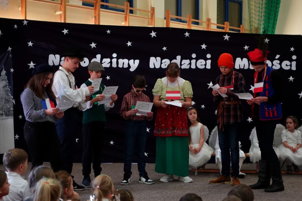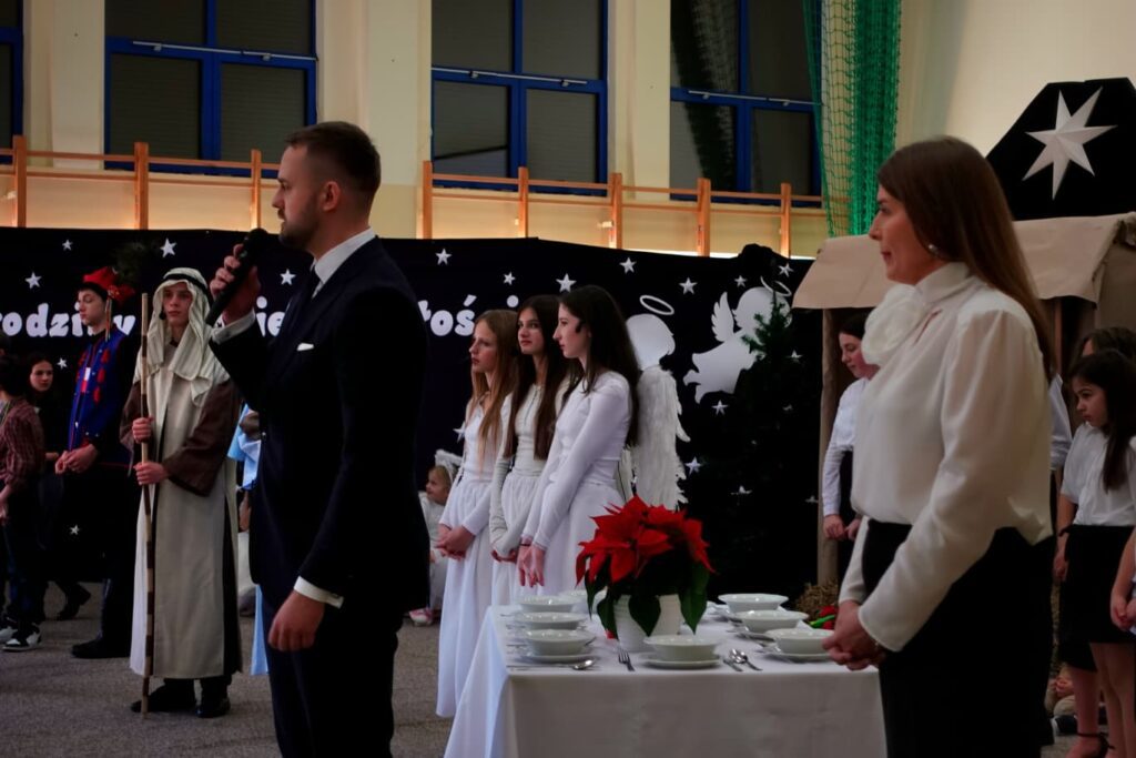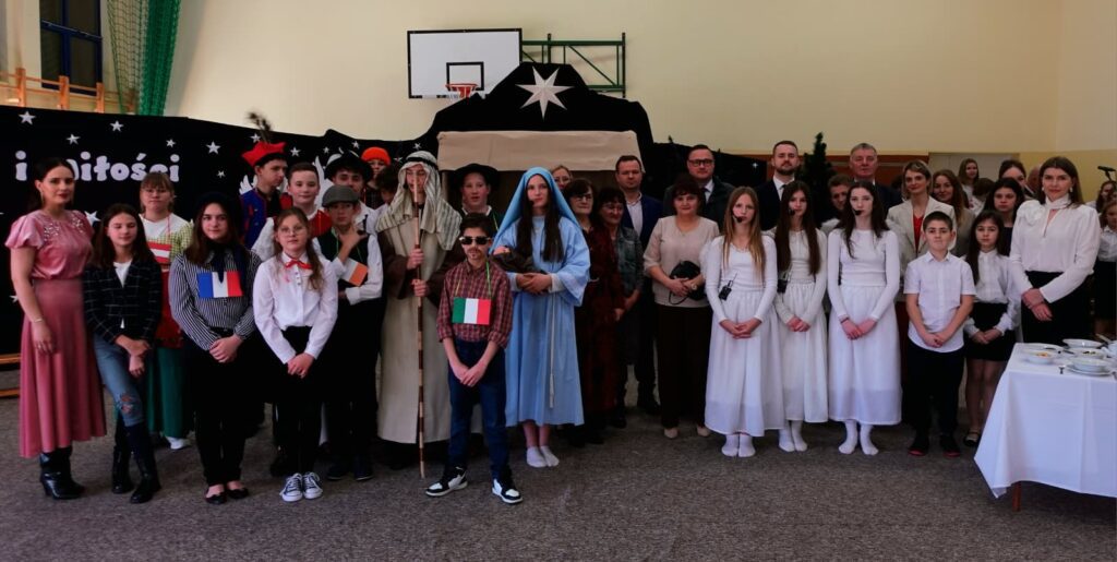 W trakcie przedstawienia poruszono temat tradycji świątecznych w różnych krajach oraz potrzebę zjednoczenia, życia w pokoju i harmonii. Uroczystość uświetniły występy chóru szkolnego pod kierunkiem Pana Jarosława Musiała.