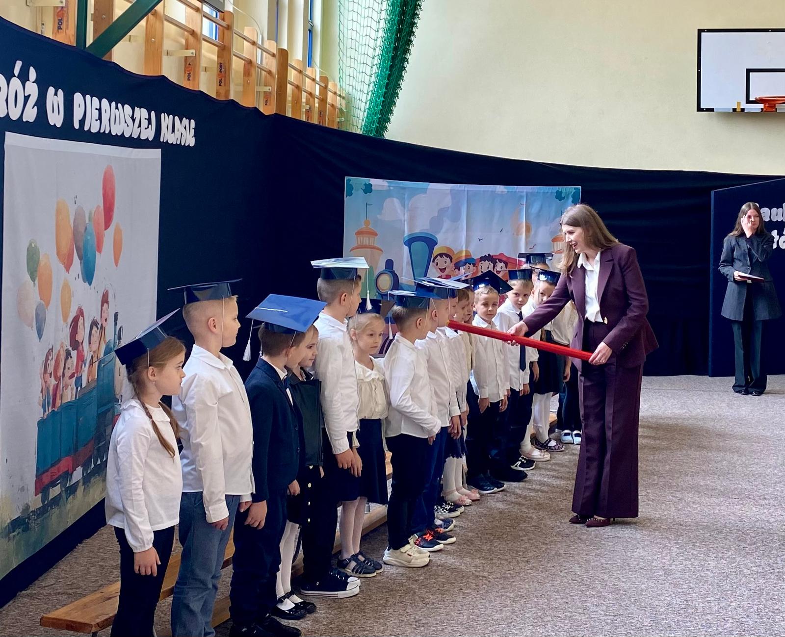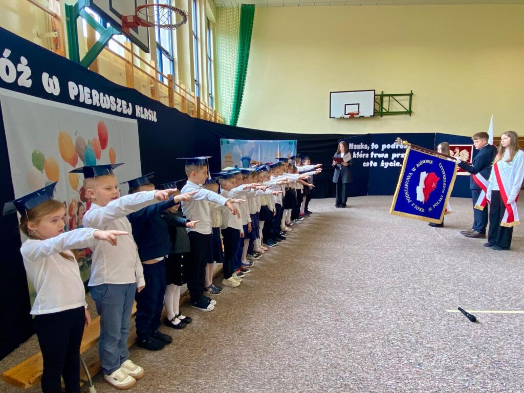 Najważniejszym momentem uroczystości było złożenie ślubowania na sztandar szkoły. Uczniowie z powagą przyrzekali, że będą pilnymi i uczciwymi uczniami, będą dbać o dobre imię szkoły i szanować jej tradycje.Po ślubowaniu pani Dyrektor dokonała uroczystego pasowania na ucznia, dotykając ramienia każdego pierwszoklasisty symbolicznym ołówkiem. Od tego momentu dzieci stały się pełnoprawnymi członkami naszej szkolnej społeczności.Każdy nowo pasowany uczeń otrzymał również legitymację szkolną, pamiątkowy dyplom oraz drobny upominek, które będą przypominały o tym wyjątkowym dniu.Uroczystość zakończyła się wspólnym zdjęciem i słodkim poczęstunkiem. To był dzień pełen emocji, wzruszeń i uśmiechów – pierwszy ważny krok w długiej i fascynującej podróży, jaką jest nauka.