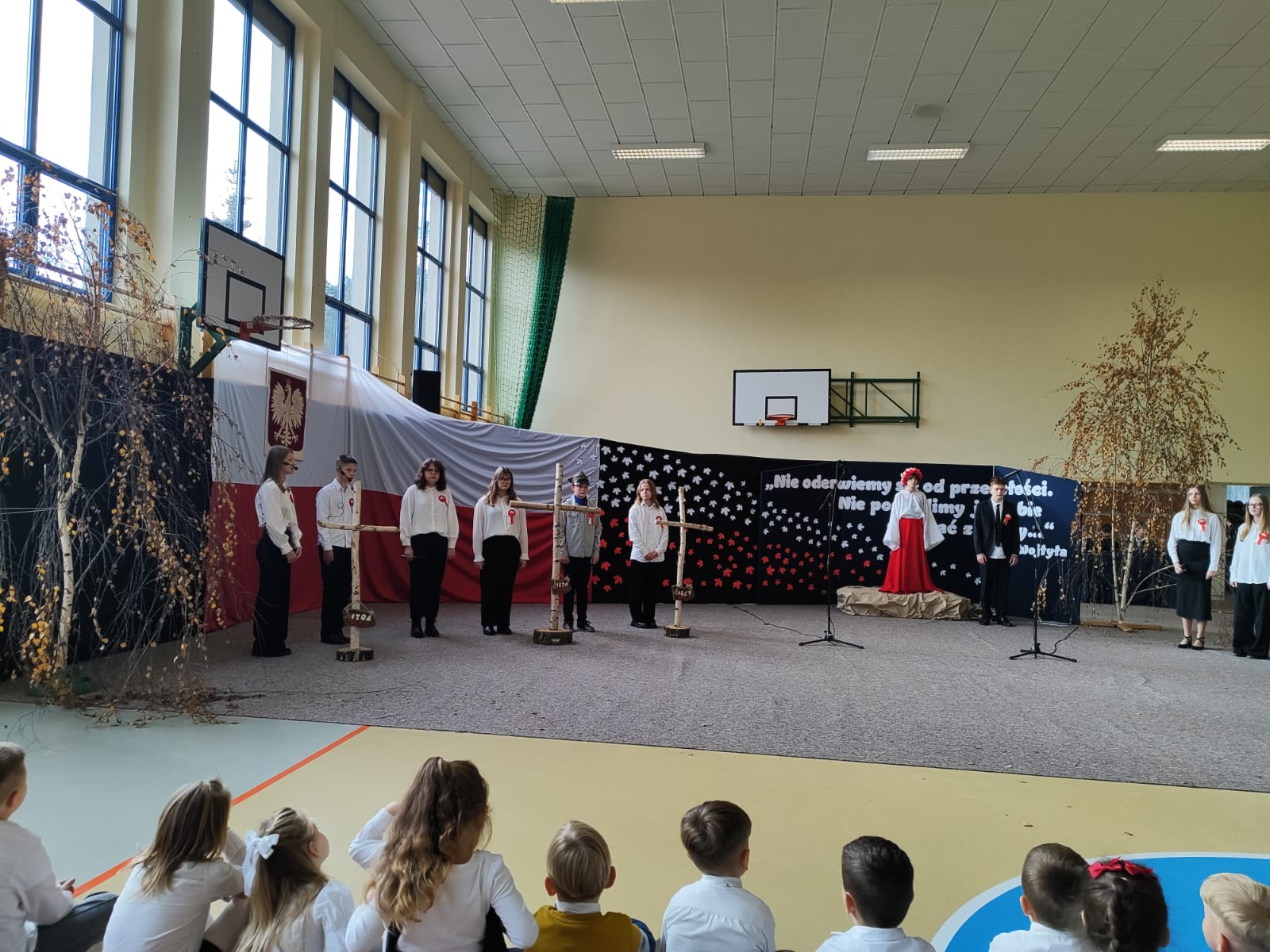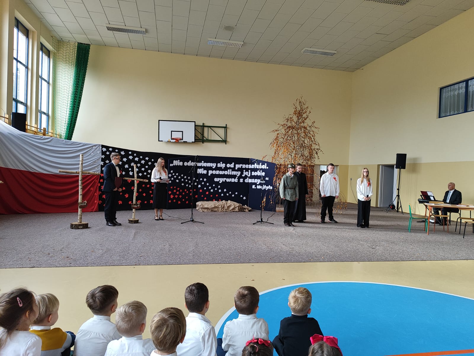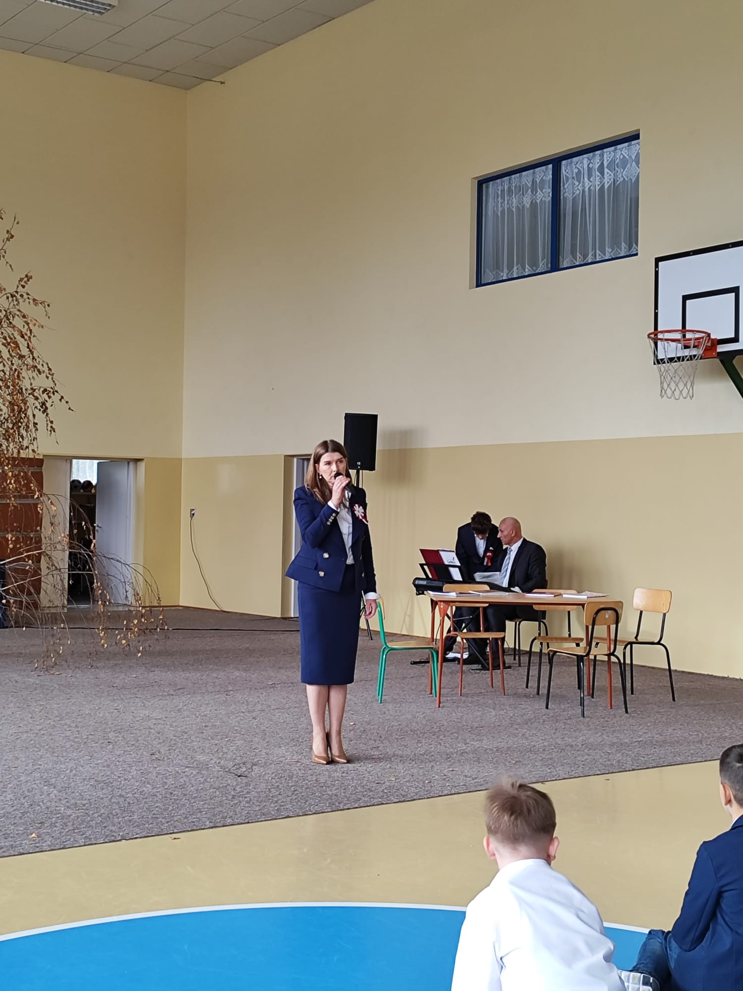 Po wzruszającym spektaklu słowno-muzycznym głos zabrała pani Dyrektor, która zwróciła uwagę na współczesne przejawy patriotyzmu, m.in. znajomość historii Polski, kultywowanie tradycji, dbałość o własny rozwój oraz odpowiedzialność za Małą Ojczyznę. Na koniec złożyła serdeczne podziękowanie obecnym Gościom, nauczycielom, rodzicom, uczniom oraz darczyńcom Szkoły za wysiłek wkładany w jej rozwój.