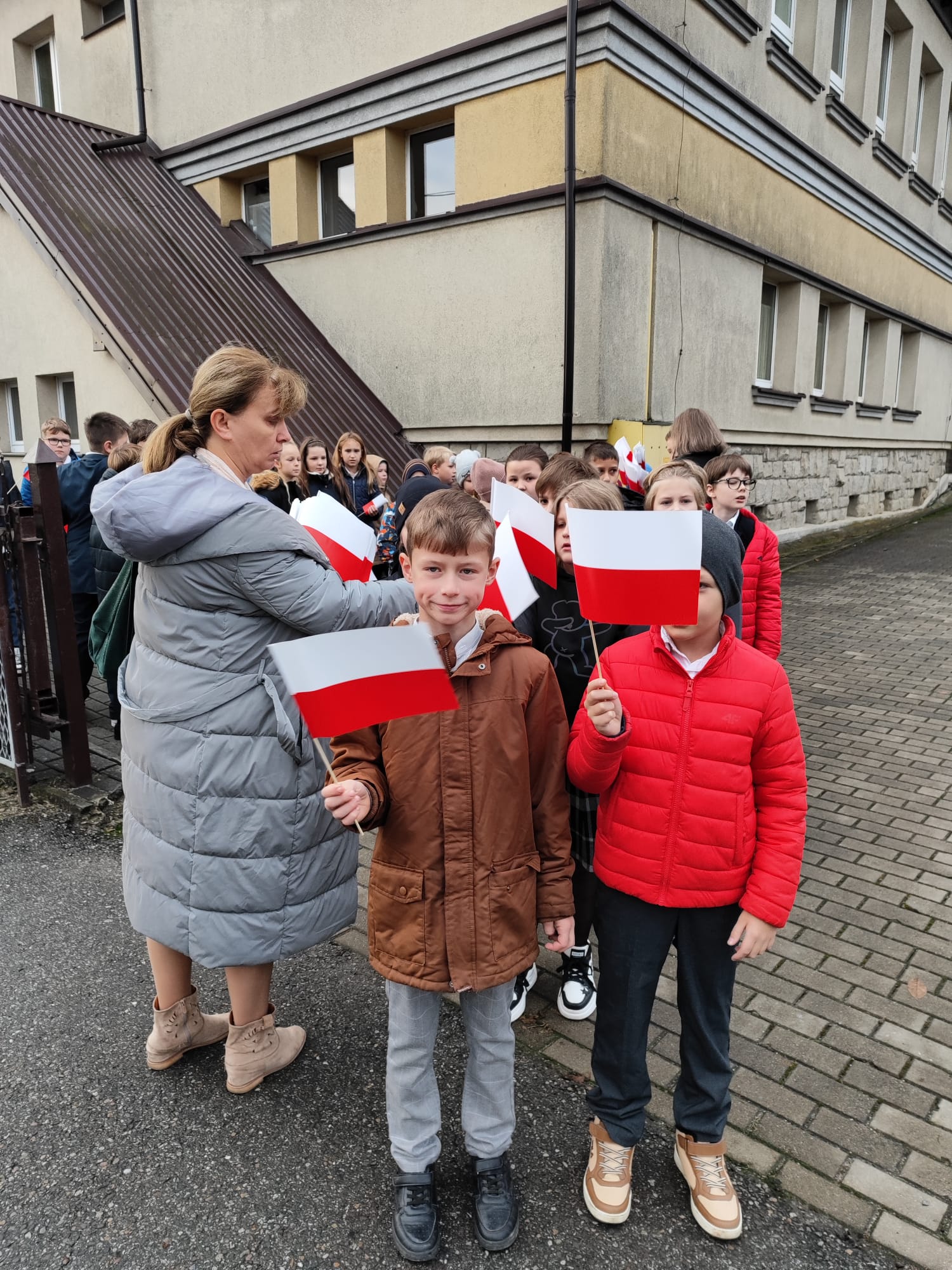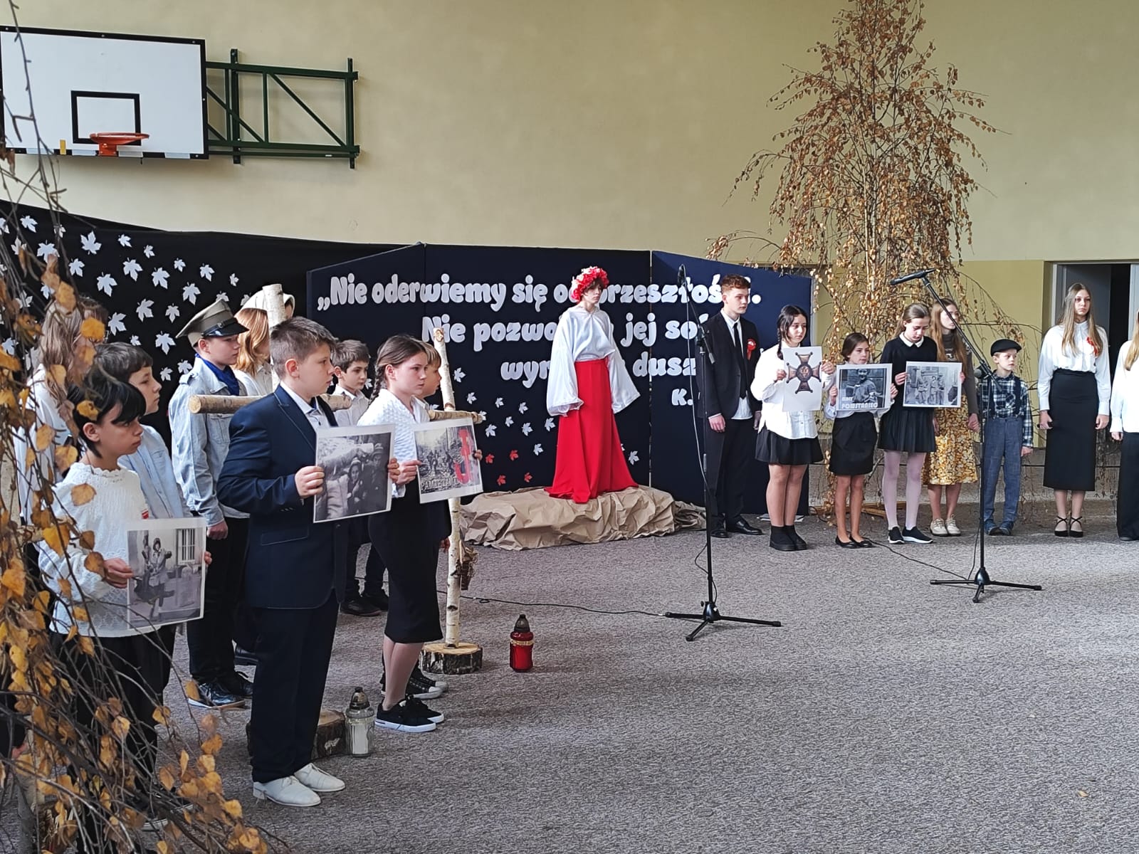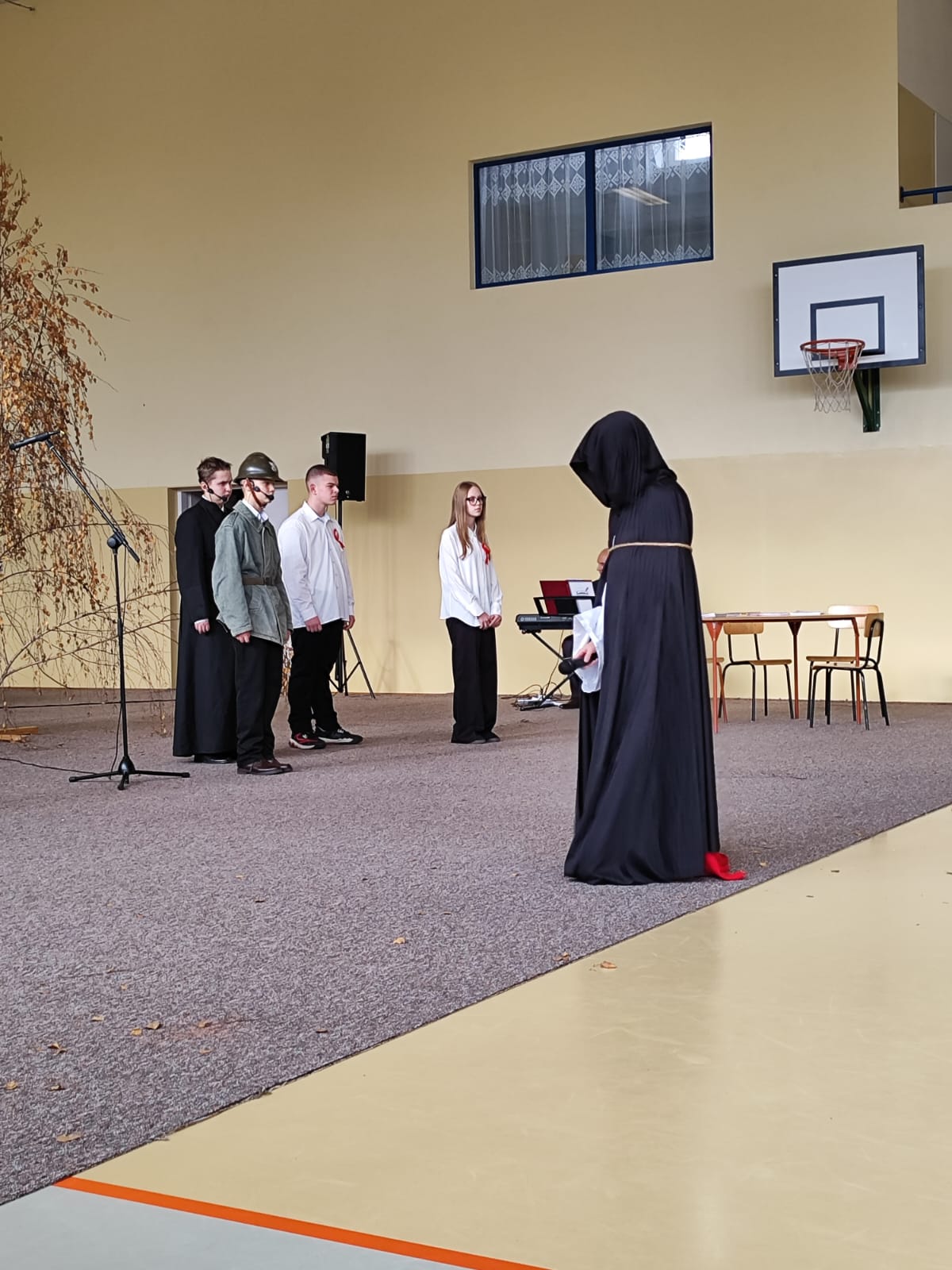 Po wzruszającym spektaklu słowno-muzycznym głos zabrała pani Dyrektor, która zwróciła uwagę na współczesne przejawy patriotyzmu, m.in. znajomość historii Polski, kultywowanie tradycji, dbałość o własny rozwój oraz odpowiedzialność za Małą Ojczyznę. Na koniec złożyła serdeczne podziękowanie obecnym Gościom, nauczycielom, rodzicom, uczniom oraz darczyńcom Szkoły za wysiłek wkładany w jej rozwój.