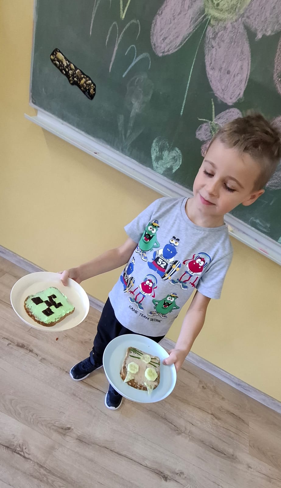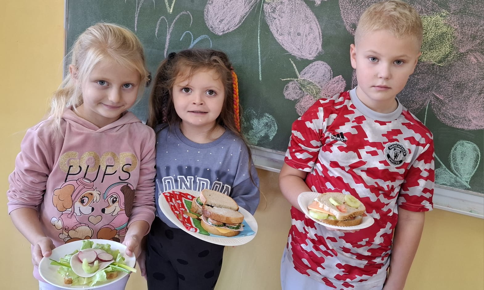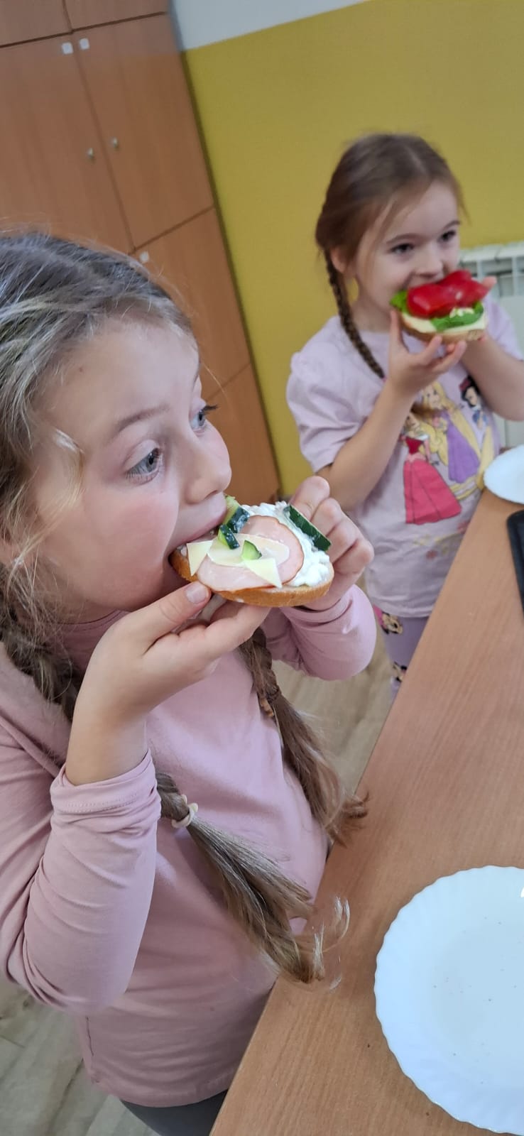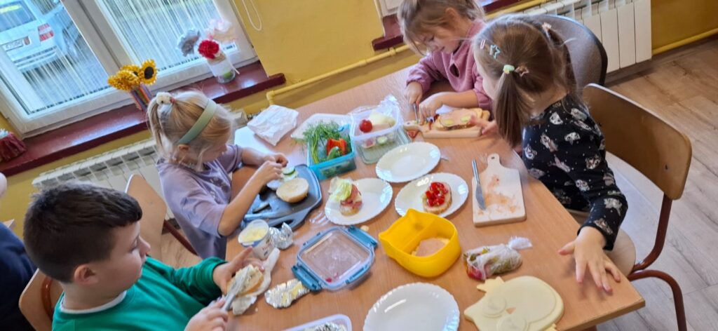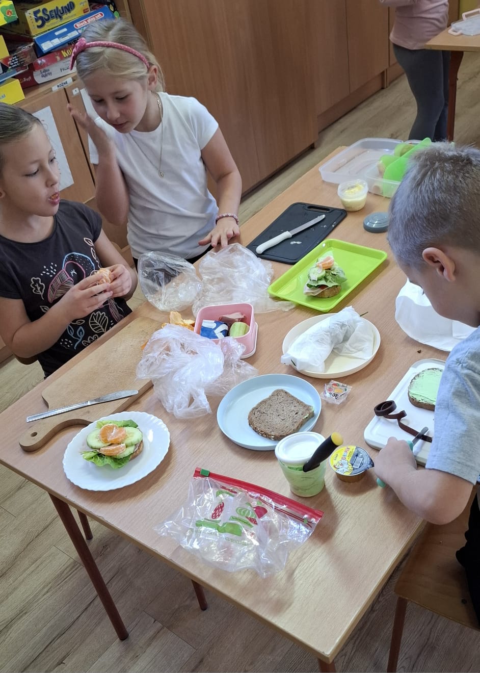 Na zakończenie zajęć uczniowie samodzielnie przygotowali zdrowe kanapki. Nie zabrakło pełnoziarnistego pieczywa, świeżych warzyw i kolorowych dodatków. Wspólne przygotowywanie posiłków było nie tylko pyszną zabawą, ale też cenną lekcją o tym, że zdrowe jedzenie może być smaczne i ciekawe.