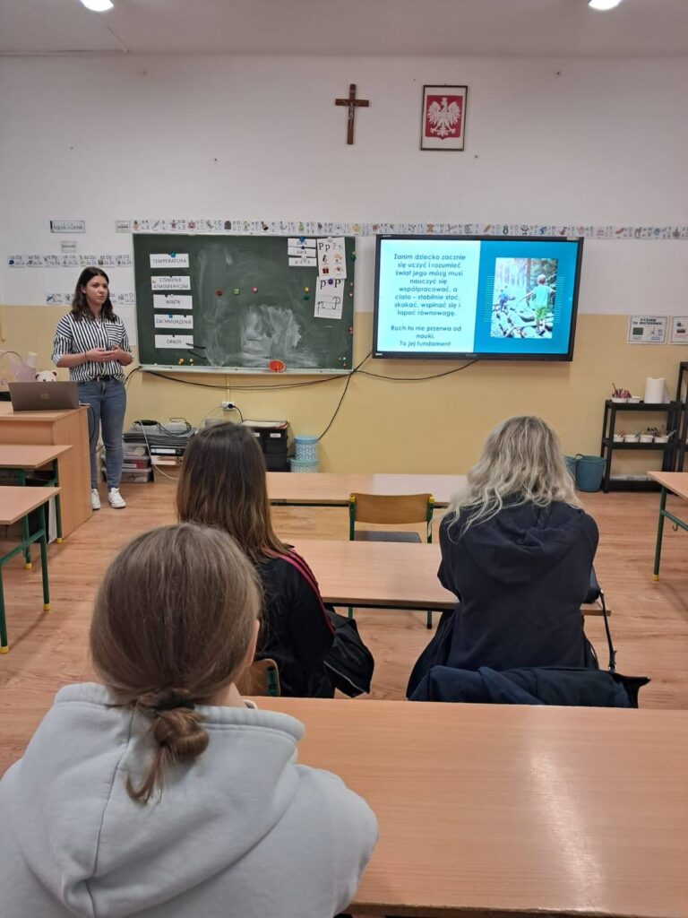 Na początku spotkania pani pedagog Katarzyna Biel poprowadziła dla rodziców niezwykle wartościowy wykład dotyczący związku aktywności ruchowej z rozwojem grafomotorycznym dzieci. Podkreśliła, jak ogromne znaczenie mają naturalne formy ruchu – wspinanie się, chodzenie boso, huśtanie, jazda na rowerze – w rozwijaniu koncentracji, koordynacji, gotowości do nauki pisania i czytania.