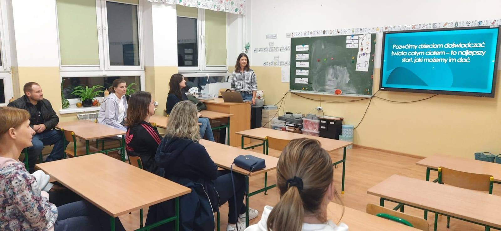 Na początku spotkania pani pedagog Katarzyna Biel poprowadziła dla rodziców niezwykle wartościowy wykład dotyczący związku aktywności ruchowej z rozwojem grafomotorycznym dzieci. Podkreśliła, jak ogromne znaczenie mają naturalne formy ruchu – wspinanie się, chodzenie boso, huśtanie, jazda na rowerze – w rozwijaniu koncentracji, koordynacji, gotowości do nauki pisania i czytania.